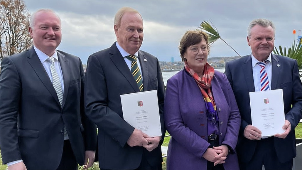 Foto vlnr.: Dr. Henning Görtz, Jürgen Schweizer, Innenministerin Dr. Sabine Sütterlin-Waack, Hans-Werner Harmuth